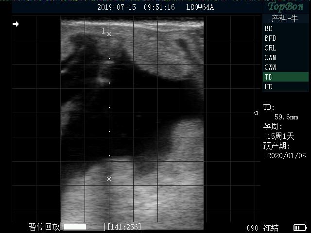首先要給牛固定,最好有限位欄,防止被牛踩到。接下來給牛掏糞,因為牛的糞便會影響B(tài)超使用效果。第三步,手持B超探頭從牛的肛門伸入體內(nèi),伸入距離大概到手的肘部位置,用手按壓探頭,使B超聲窗和直腸緊密接觸,然后聲窗左右來回擺動,觀察到牛的子宮或者胎仔停止擺動,仔細(xì)觀察效果。不同時期胎仔的成像效果不同,這要結(jié)合牛的配種時間和臨床經(jīng)驗來判斷是否懷孕,下面是母牛懷孕3個月左右效果。拓邦B超不僅能清晰檢查懷孕情況,還能通過軟件測量,測量胎仔大概懷孕天數(shù)和預(yù)產(chǎn)日期,便于初學(xué)者學(xué)習(xí)使用。
